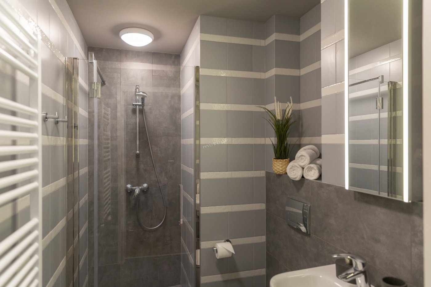 W łazienkach: prysznic, umywalka, toaleta, suszarka, ręczniki, mydło w płynie.
