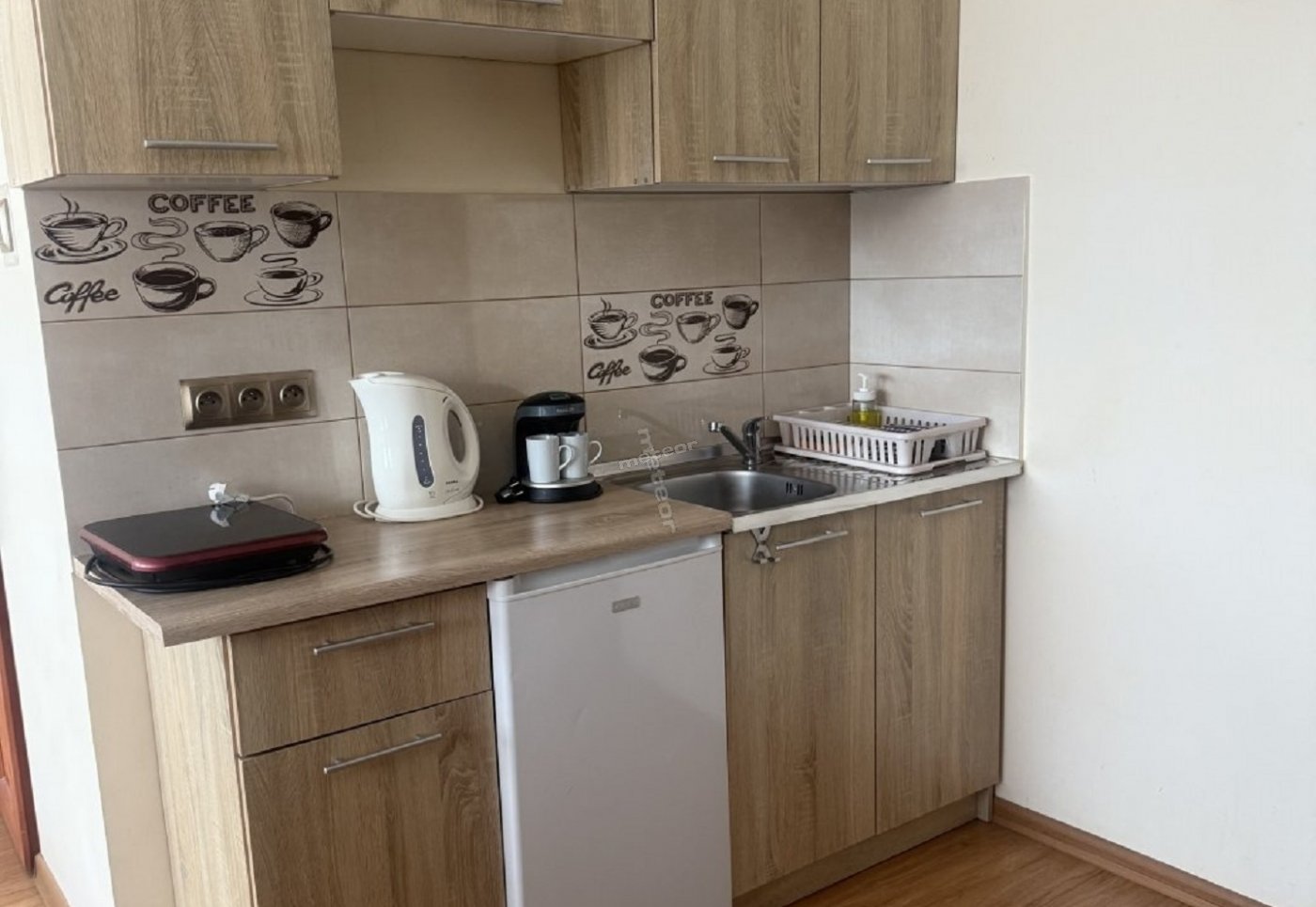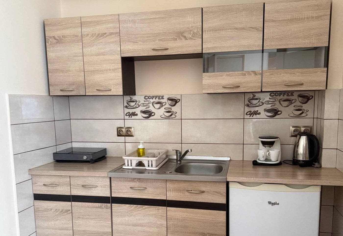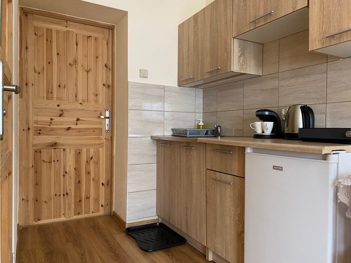 Aneks kuchenny, który jest w pełni wyposażony, posiada lodówkę, zlewozmywak, kuchenkę, czajnik elektryczny, ekspes do kawy, wszystkie akcesoria kuchenne potrzebne do samodzielnego przygotowania posiłku.