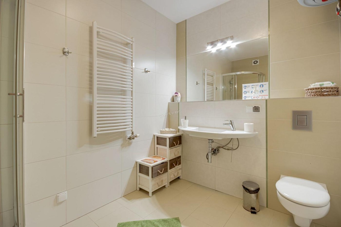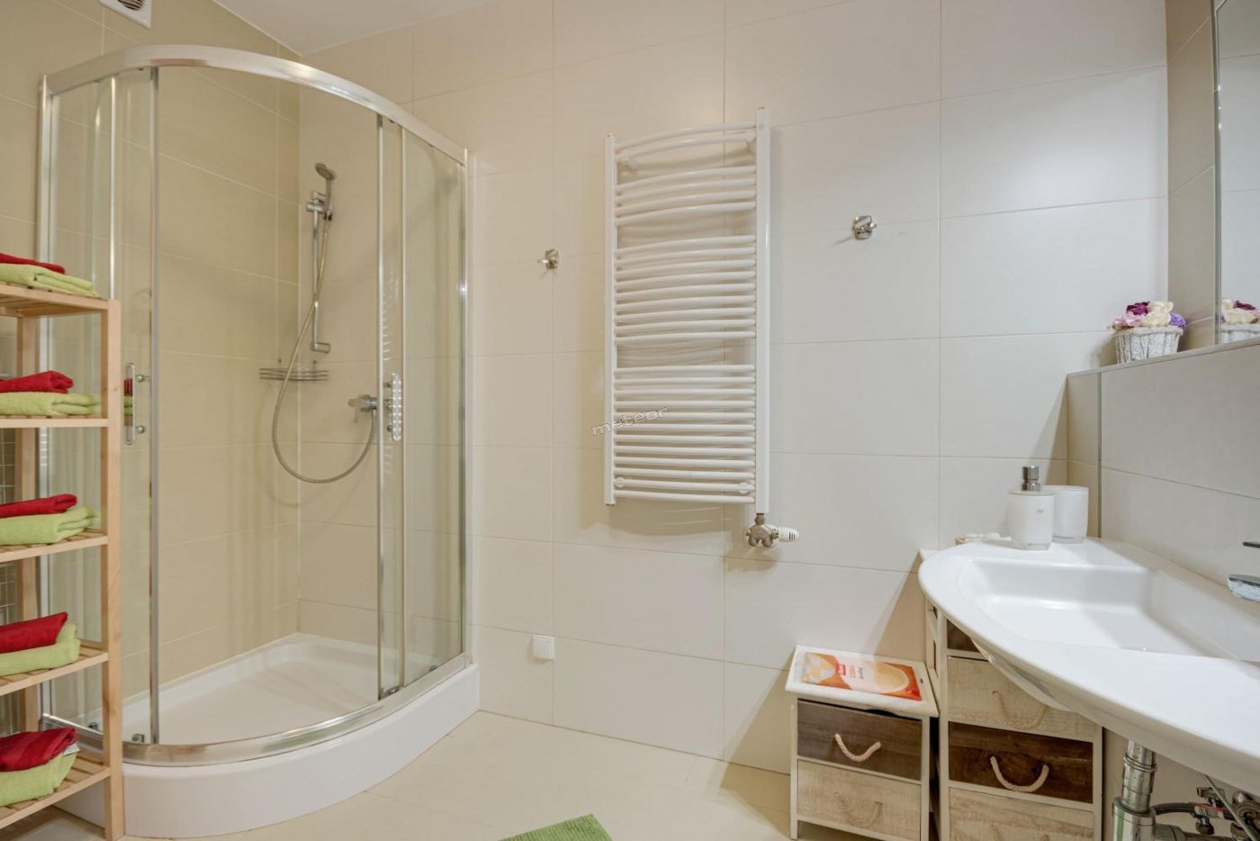 W aneksie kuchennym: lodówka, kuchenka indukcyjna, mikrofala, czajnik elektryczny, zmywarka, ekspres do kawy, minigrill, komplet naczyń, patelnie, garnki.