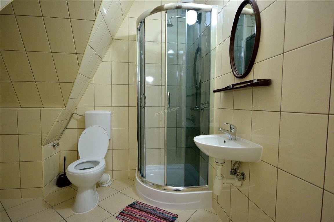 Wyposażenie łazienki: kabina prysznicowa, umywalka, WC.