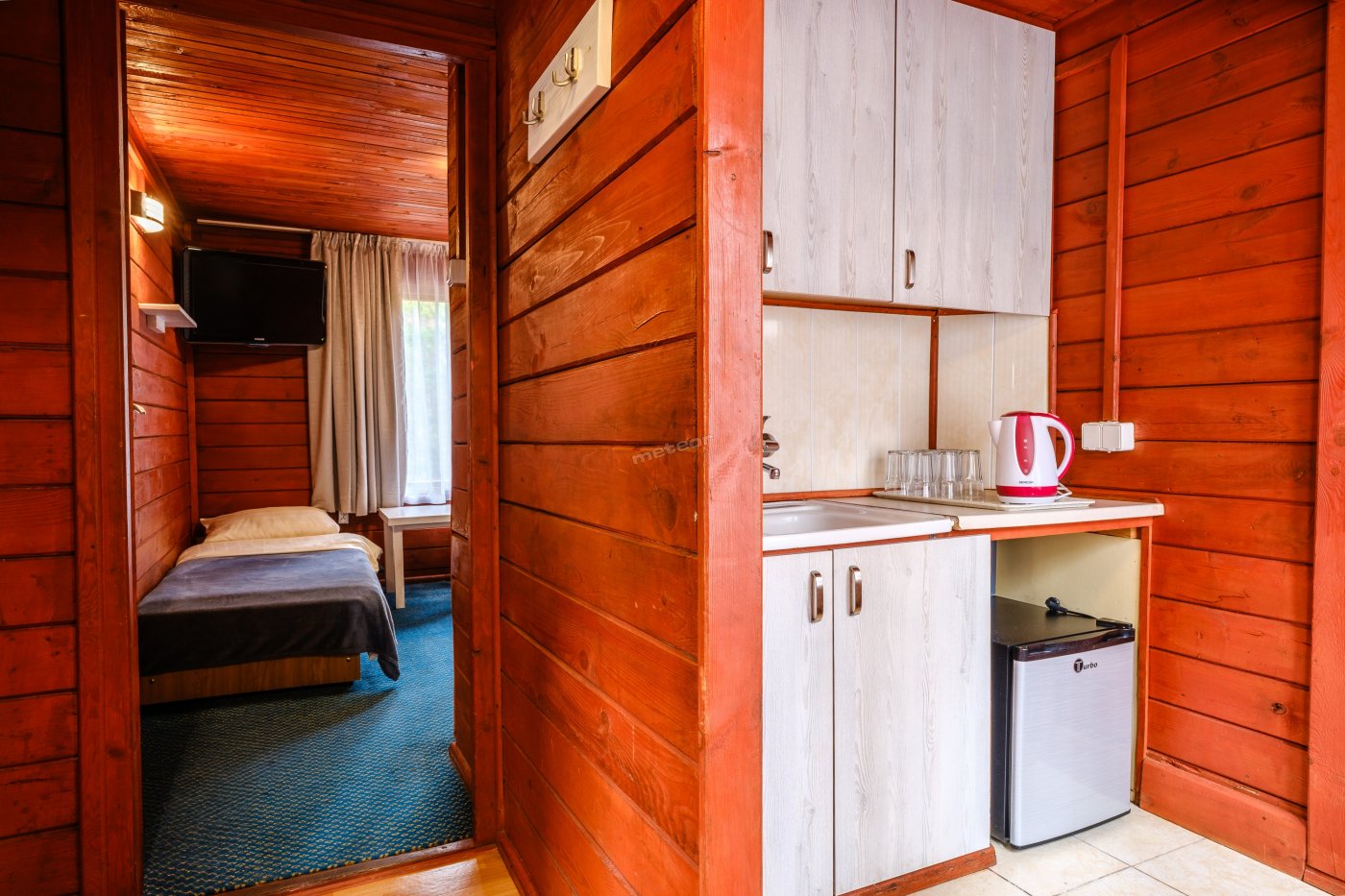 Domek 5-osobowy z salonem - salon: narożnik 2-os., pokój 2-os.(przechodni do pokoju 1-os.), łazienka, aneks kuchenny: lodówka, czajnik