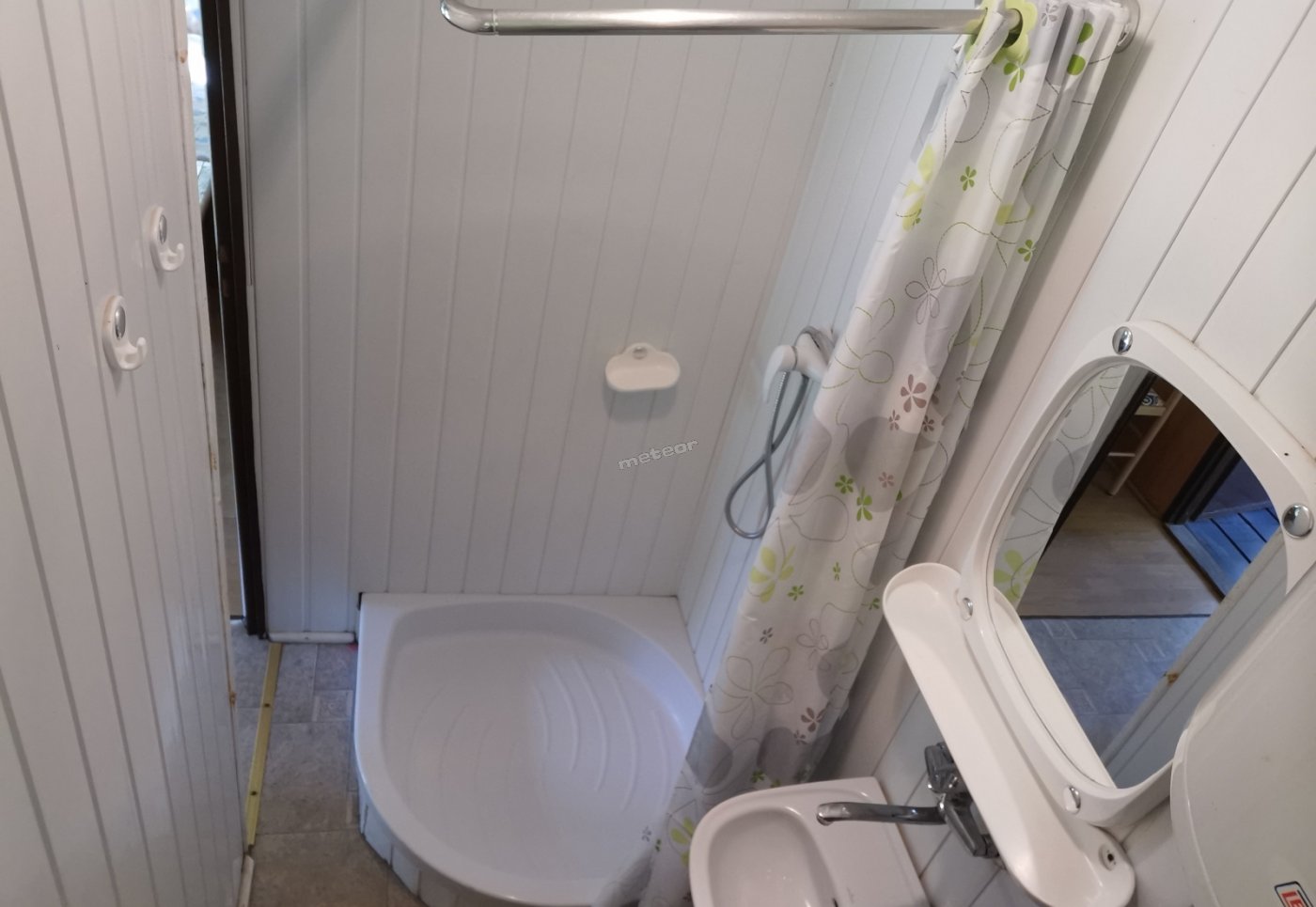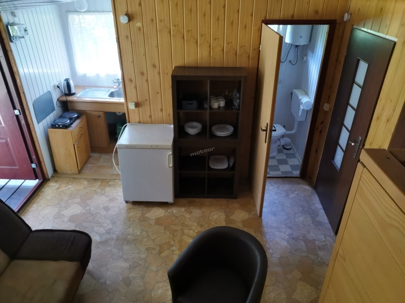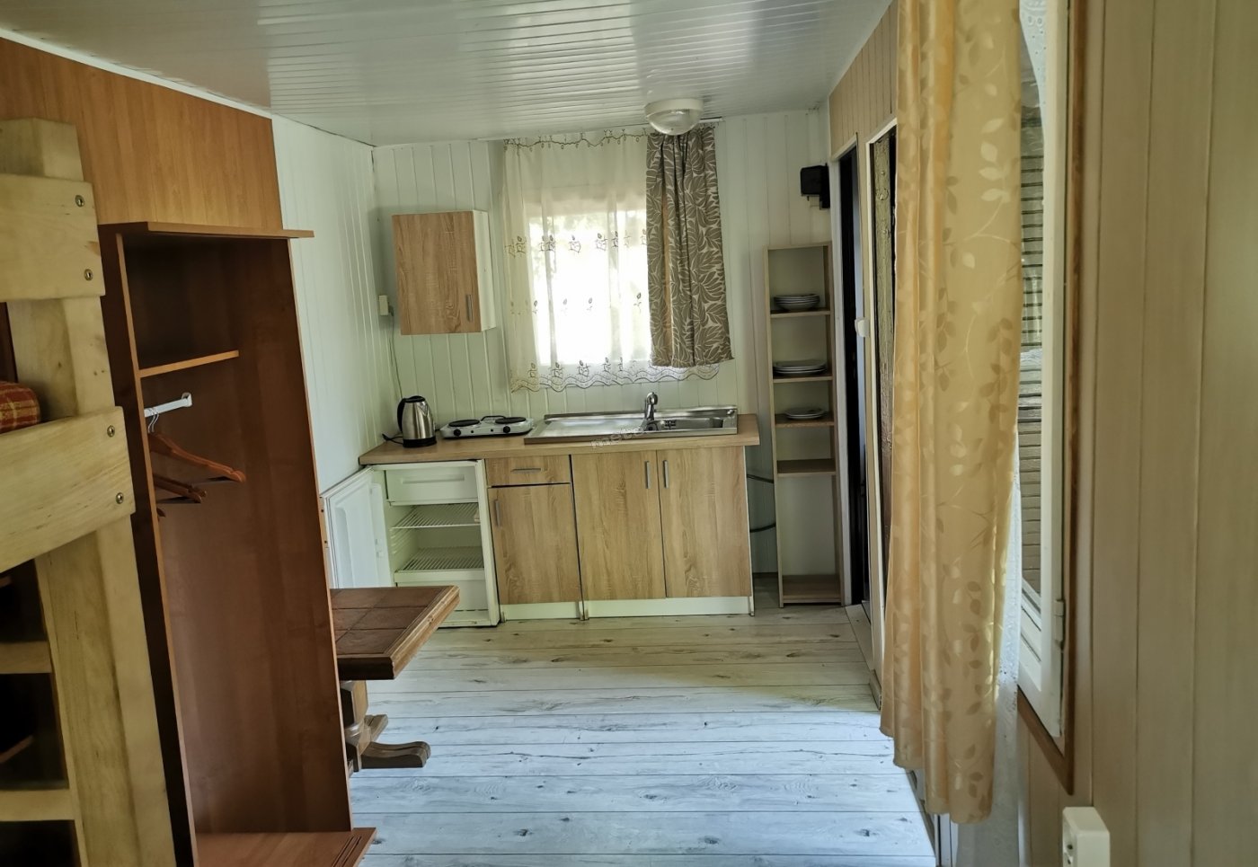 Wszystkie domki posiadają pełen węzeł sanitarny oraz aneks kuchenny wyposażony w kuchenkę elektryczną 2-palnikową, czajnik elektryczny, talerze, kubeczki, sztućce.