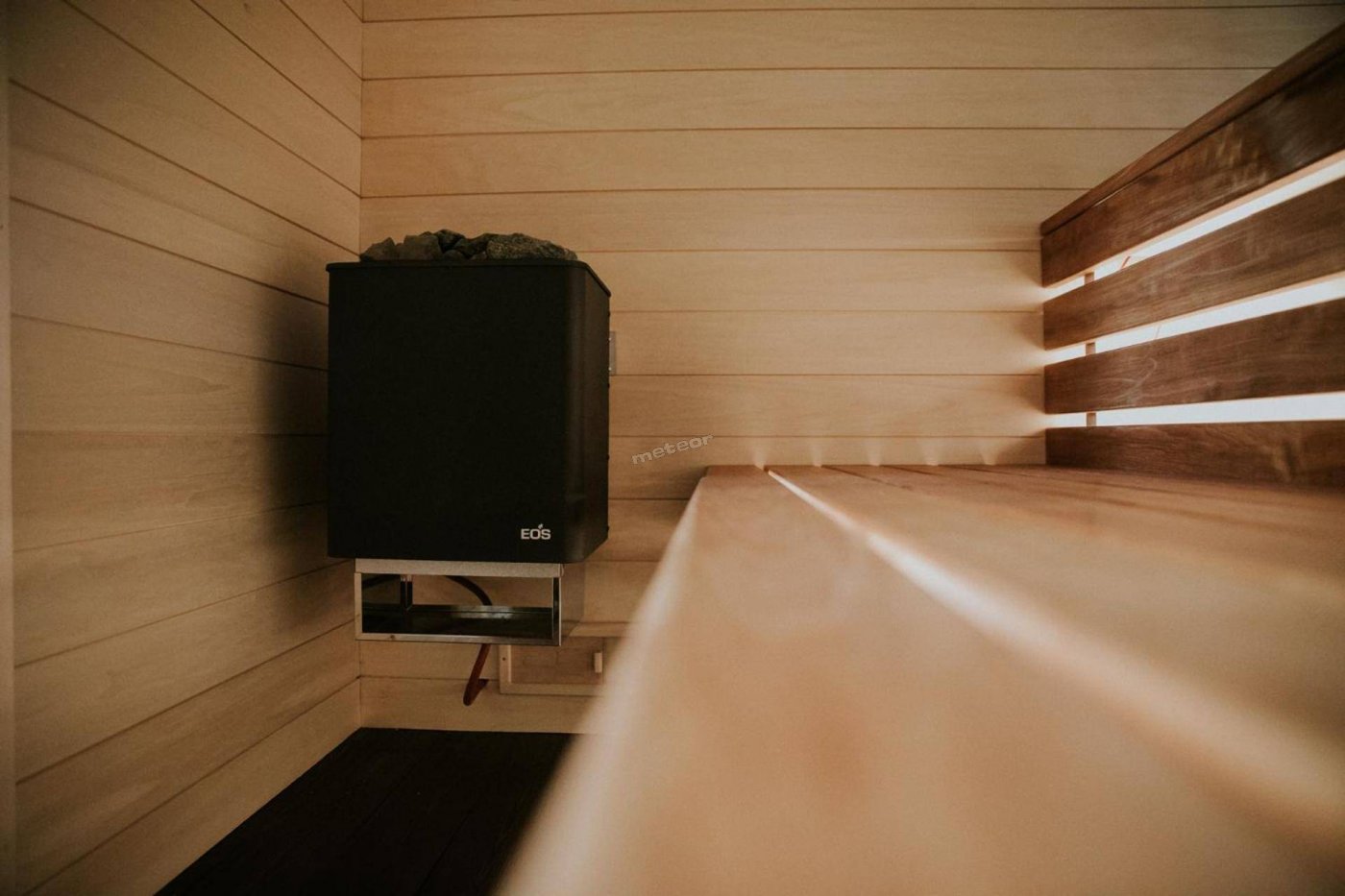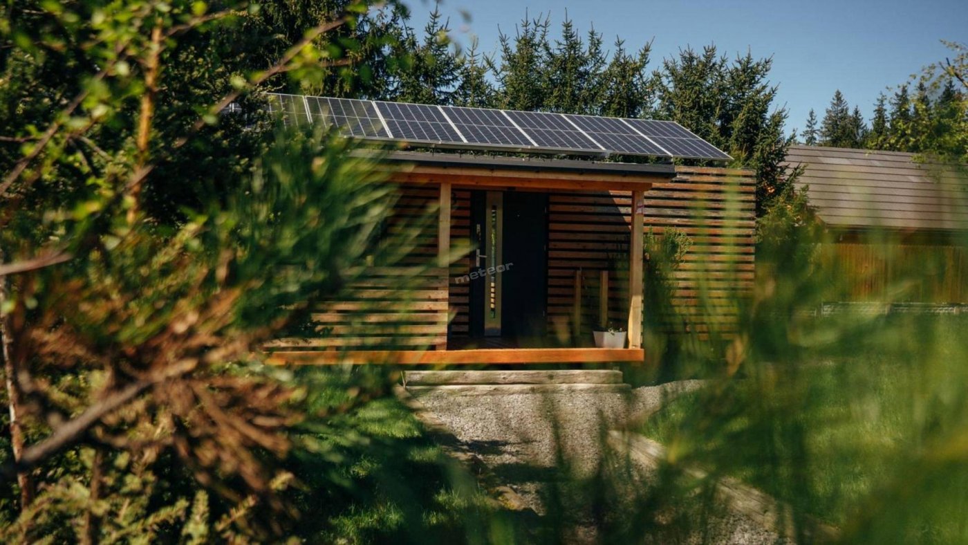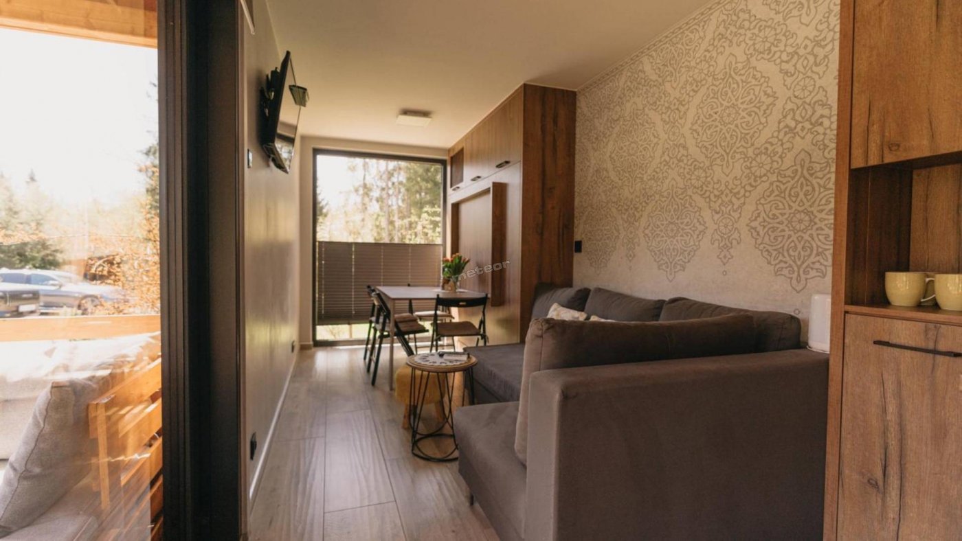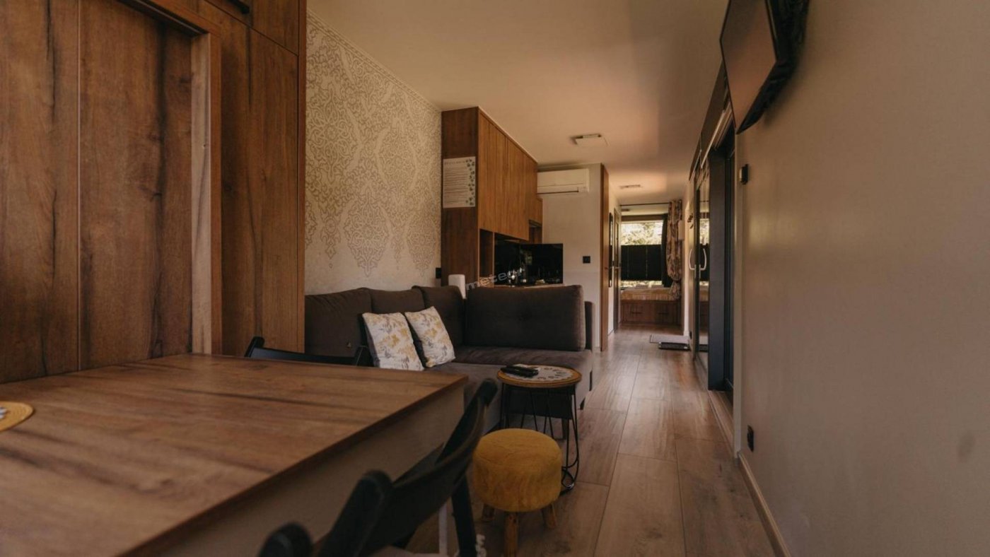 W domku: kanapa, komfortowa kapsuła, stolik, aneks kuchenny, minimalistyczna łazienka, bezpłatne Wi-Fi, TV, taras z meblami ogrodowymi.