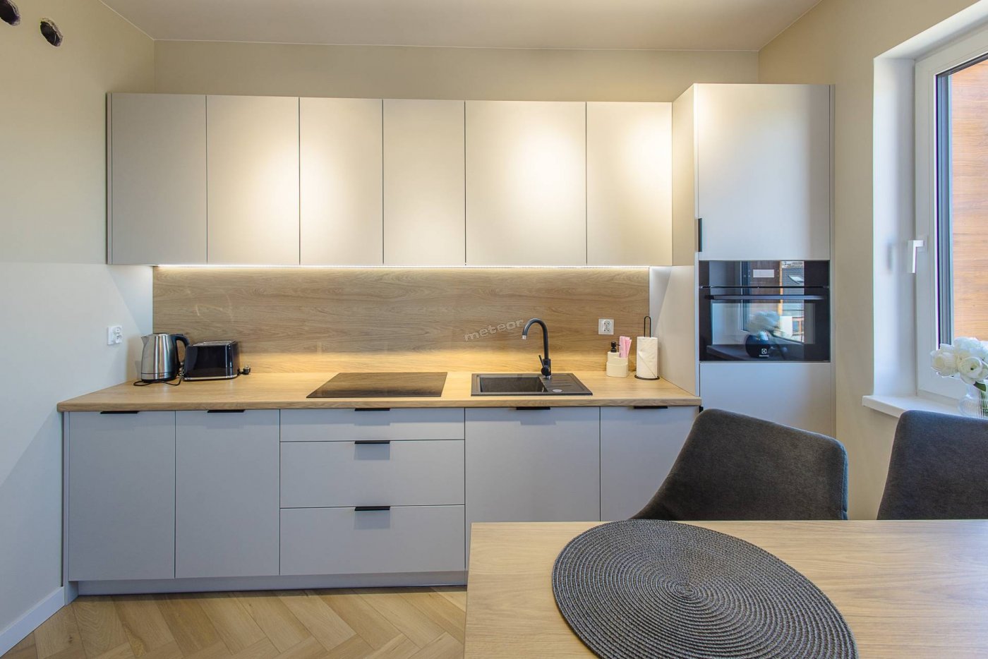 Na wyposażeniu kuchni: lodówka, czajnik, płyta kuchenna, zmywarka, kuchenka mikrofalowa, toster.