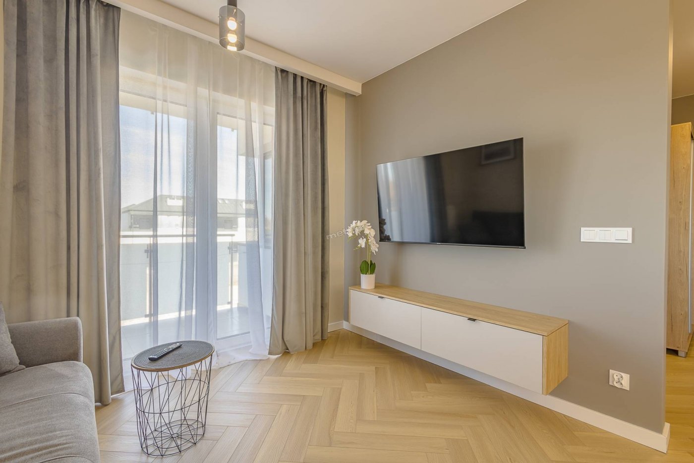 W apartamencie jest sypialnia, salon, wyposażona kuchnia i łazienka.