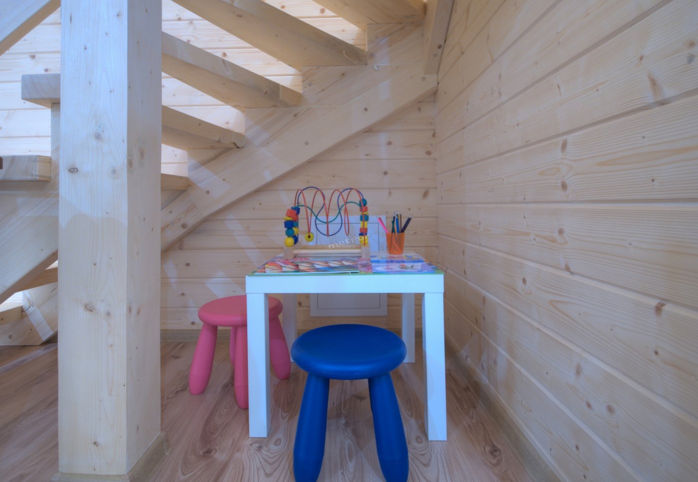 - na parterze: pokój dzienny (rozkładana kanapa 2-osobowa, szafa, TV, stół, krzesła); aneks kuchenny (lodówka, zmywarka, czajnik elektryczny, mikrofalówka, płyta grzewcza, garnki, patelnie, sztućce, zastawa stołowa); łazienka (kabina prysznicowa, suszarka do włosów, ręczniki); kącik malucha, żelazko i deska do prasowania;
